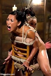 Welcome Tia Ling back to Whipped Ass in one of her hottest movies yet! In the first scene Tia is strung up by a brutal crotch rope parting her beautiful pussy lips while she is whipped, choked and has her large full breasts humiliatingly milked by Aiden Starr! Tia is then oiled up and tied to a chair in such a way that her round ass is perched up for a tough spanking until her ass is deep red. She then has her pussy lips adorned with clamps and weights and her ass penetrated with an acrylic dildo. Aiden discovers more milk dripping from this hard-bodied sluts tits and fists and fucks her making her milk her own tits and receive pain as she cums. All at the same time! As if thats not enough Tia is made to lick ass and bent over and strap-on ass fucked in doggie style until every orgasm is ripped from her hot body!